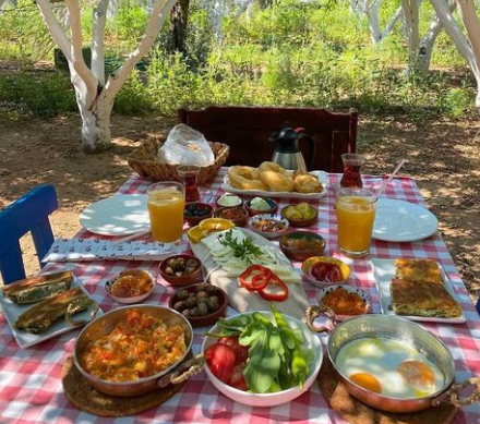 Sahanda yumurta, pişi, mücver, patates kızartması, Ege otlu börek, 3 çeşit peynir, 3 çeşit zeytin, domates – salatalık – biber – yeşillik söğüş tabağı, 4 çeşit ev yapımı reçel – yaprak sarma, tereyağ, bal, acuka, meyve ve sınırsız çay.